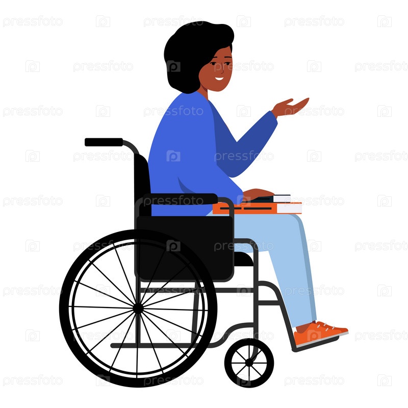 Девочка-инвалид сидит в инвалидной коляске. Ученица-инвалид держит учебники на коленях. Персонаж на белом фоне