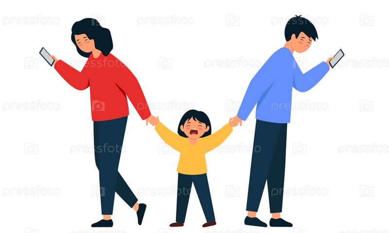 Родители игнорируют ребенка. Отец и мать держат плачущую дочь за руку. Иллюстрация на белом фоне