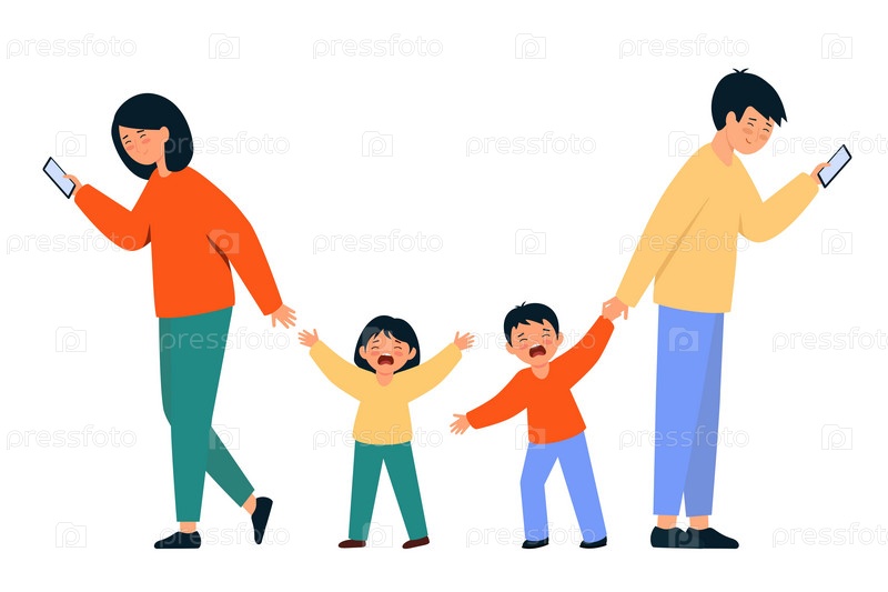 Родители игнорируют своего ребенка. Мужчина и женщина смотрят в смартфоны и не обращают внимания на плач. Иллюстрация на белом фоне