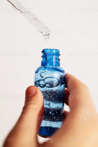 Крупный план женской руки с прозрачным флаконом синей увлажняющей сыворотки для лица. Молодая женщина держит косметический продукт. Витаминная антивозрастная эссенция для кожи на белом изолированном фоне