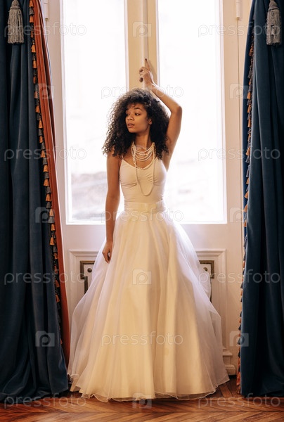 Кудрявая очаровательная африканка в элегантном белом платье стоит возле декорированных ретро-дверей и держится за раму. Винтажный классический интерьер