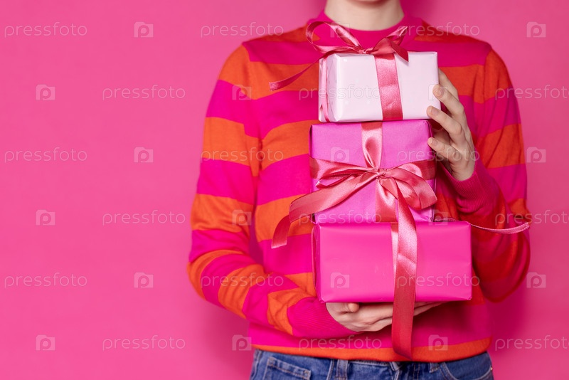 Половина девочки в розовом свитере с подарками на розовом фоне