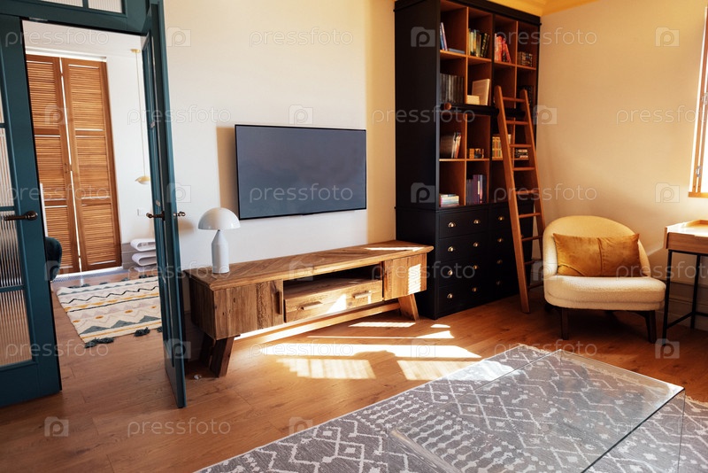 Крупный план элегантного кресла из оранжевой ткани и деревянных элементов