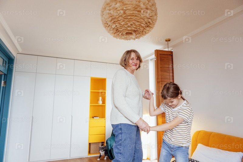 Пожилая женщина и ее внучка развлекаются дома. Милая девочка и ее бабушка смеются и дурачатся в спальне