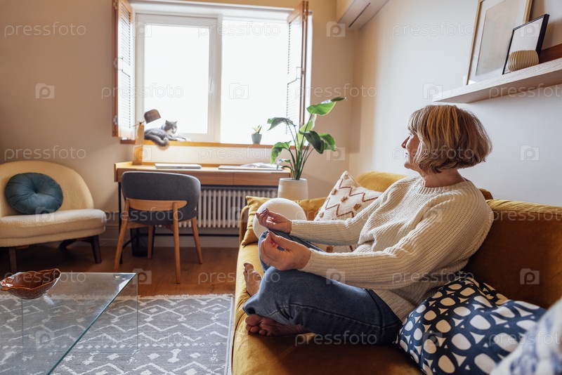 Пожилая женщина сидит на диване в позе лотоса. Зрелая дама медитирует на диване в гостиной
