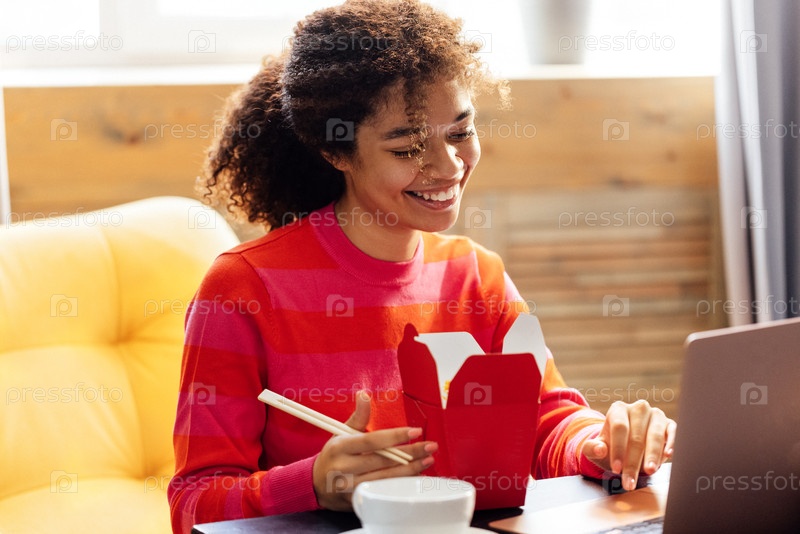 Милая африканская женщина в свитере сидит в желтом кресле и ест лапшу палочками