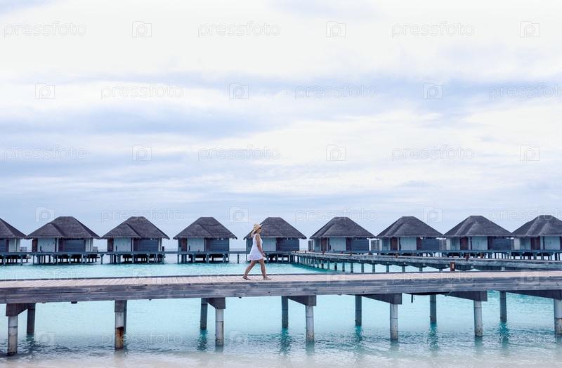 Молодая женщина в шляпе и платье идет по деревянным мостикам к гостиничному дому. Виллы с соломенными крышами над морской водой