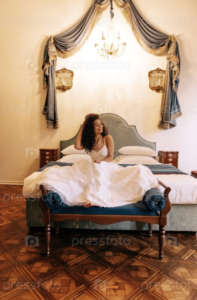 Милая африканская женщина в белом элегантном платье и драгоценностях сидит на ретро-кровати и улыбается. Черная девушка отдыхает в гостиничном номере. Винтажный классический интерьер