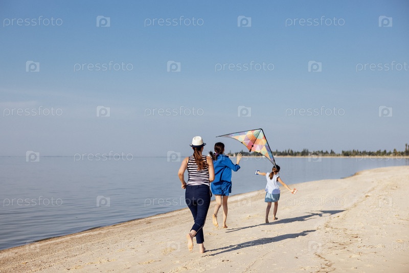 Молодая счастливая семья на летних каникулах. Дети и их родители запускают воздушного змея на берегу реки