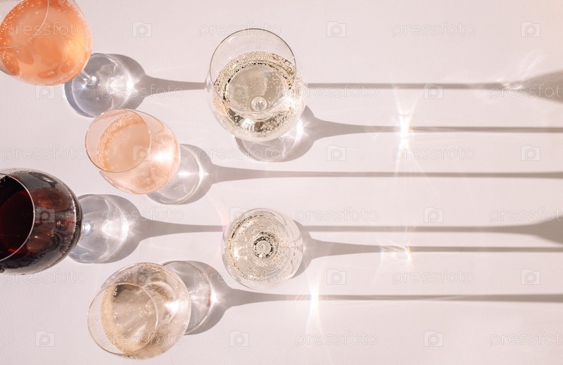 Крупный план элегантных бокалов с алкогольными напитками. Чашки с разноцветными игристыми винами из разных сортов винограда