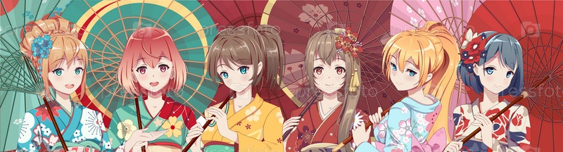 Группа девушек аниме манга в традиционном японском костюме кимоно, держащих бумажный зонтик. Векторная иллюстрация на изолированном фоне