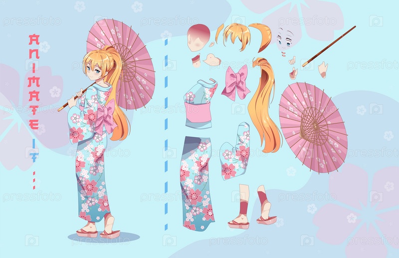 Аниме девушка в кимоно с зонтиком персонажи для анимации