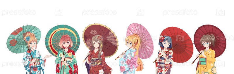 Группа девушек из аниме-манги в кимоно, держащих бумажный зонтик
