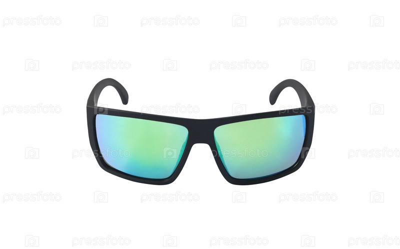 Вид спереди поляризованных очков с черной оправой и цветными линзами, изолированных на белом фоне