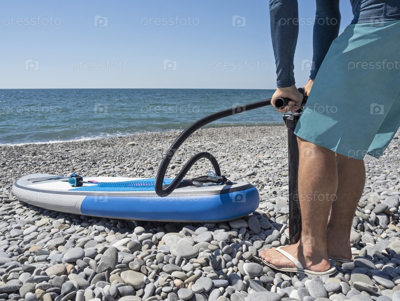 Мужчина надувает доску для серфинга с веслом ручным насосом на фоне моря