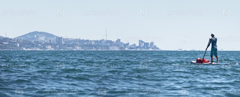 Активный мужчина занимается греблей на доске SUP с водонепроницаемым чехлом на фоне побережья города Сочи