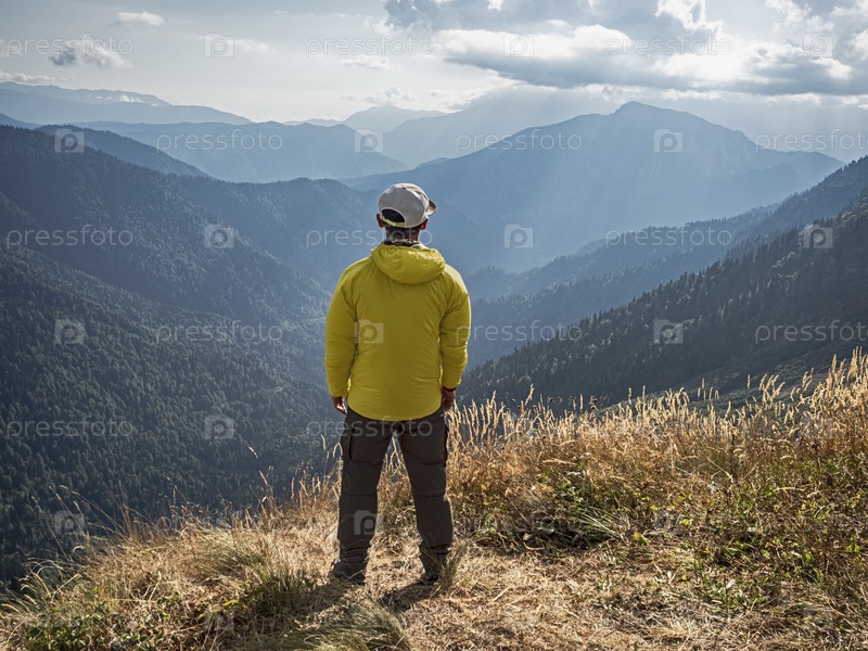 Активный турист на фоне панорамных гор и солнечного света