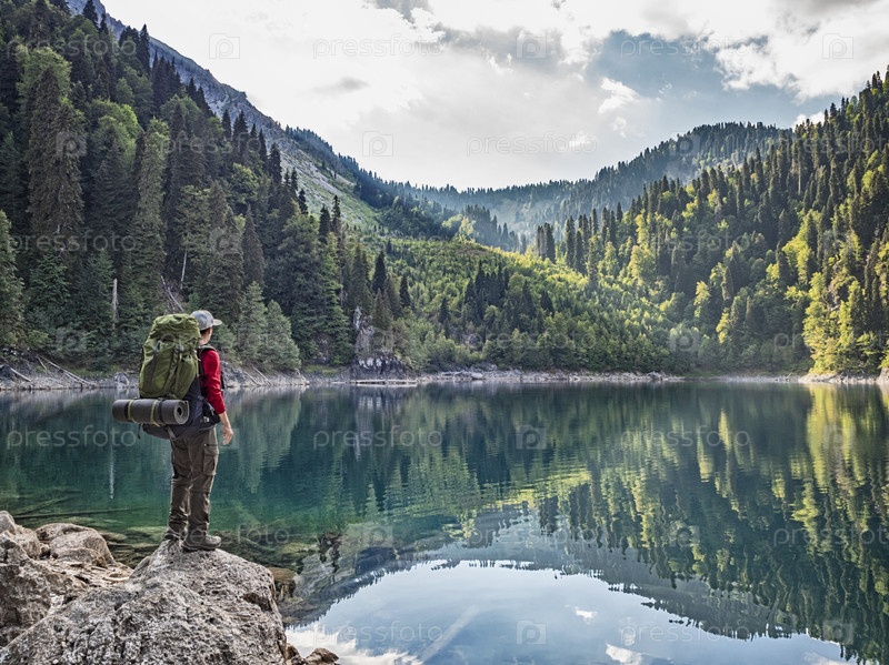 Активный турист с рюкзаком стоит на фоне озера Малая Рица в горах Кавказа в Абхазии