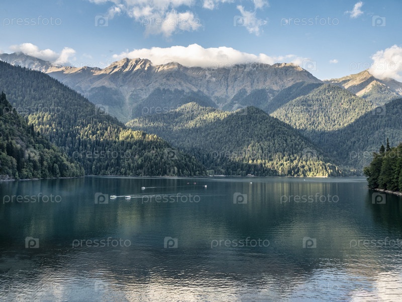 Озеро Рица на фоне Кавказских гор. Знаменитое место в Абхазии