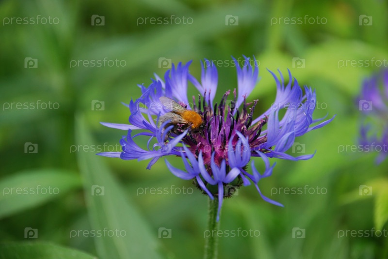 Василек горный из семейства Астровые. Centaurea montana стоит на зеленом стебле среди зеленой травы и других растений. Соцветие имеет длинные тонкие фиолетовые лепестки, на цветке сидит шмель