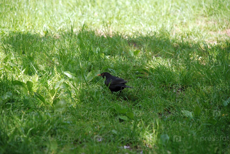Черный дрозд в зеленой траве