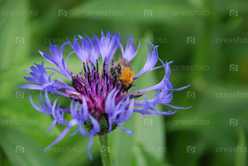 Василек горный из семейства Астровые. Centaurea montana стоит на зеленом стебле среди зеленой травы и других растений. соцветие имеет длинные тонкие фиолетовые лепестки, на цветке сидит шмель