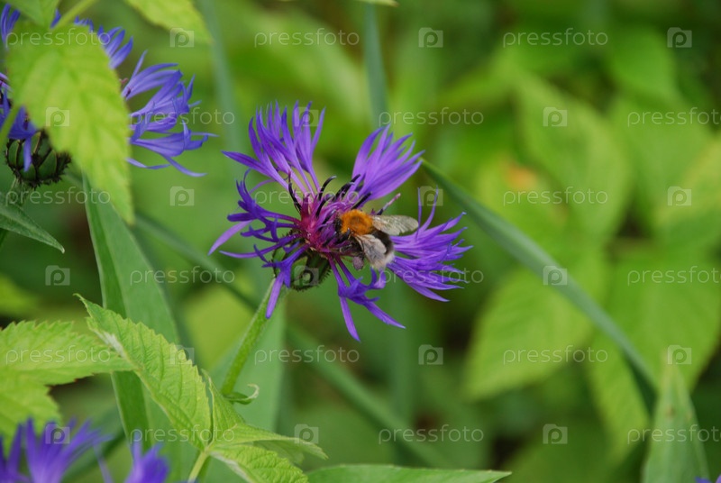 Василек горный из семейства Астровые. Centaurea montana стоит на зеленом стебле среди зеленой травы и других растений. соцветие имеет длинные тонкие фиолетовые лепестки, на цветке сидит шмель