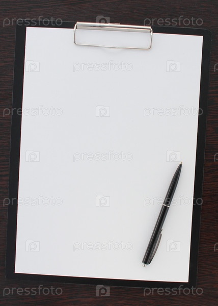 Черная ручка и пустой лист бумаги лежат на деревянном столе