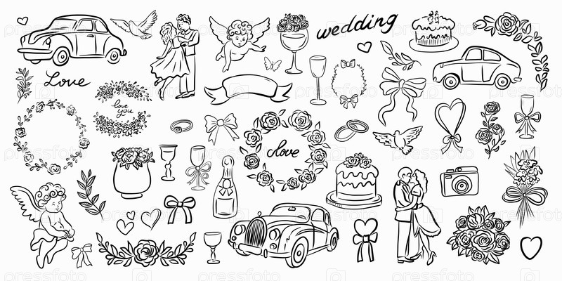 Очаровательная коллекция свадебной графики с автомобилями, цветами, сердцами и очаровательными ангелочками