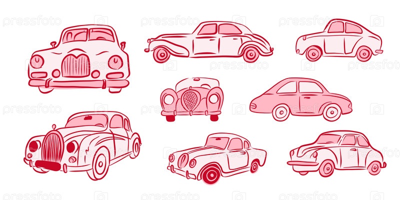 Иллюстрации старинных автомобилей, представленные в элегантном стиле красной линии для любителей искусства