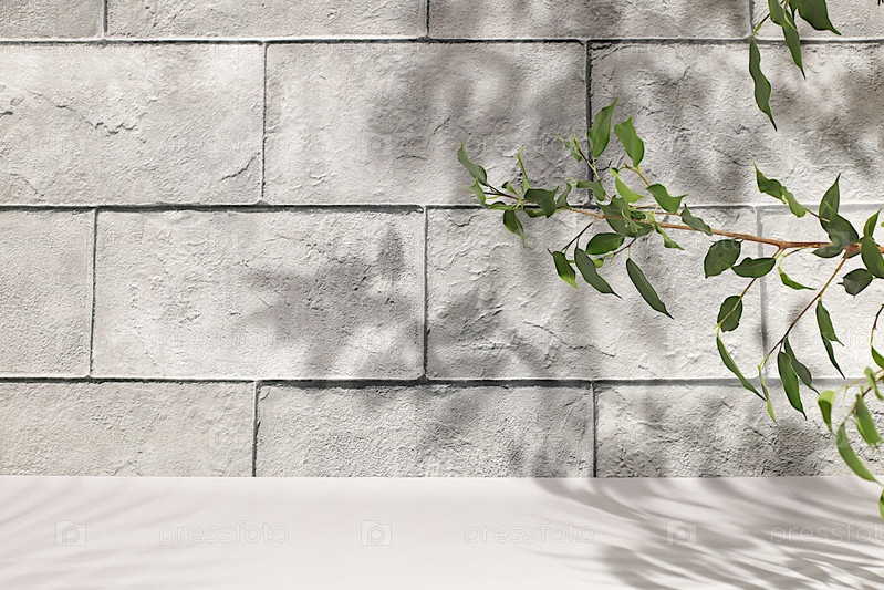 Бетонная стена с жесткими тенями от пальмовых листьев, Премиум пустой подиум. Минимальный абстрактный фон для презентации косметических продуктов, эстетика красоты, шаблон дизайна