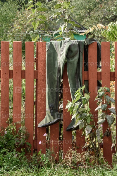 Водолазный костюм сушится на деревянном заборе в саду