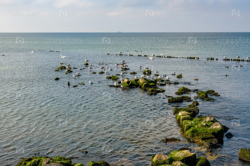 Чайки сидят на камнях на Балтийской косе. Балтийск. Калининградская область. Россия