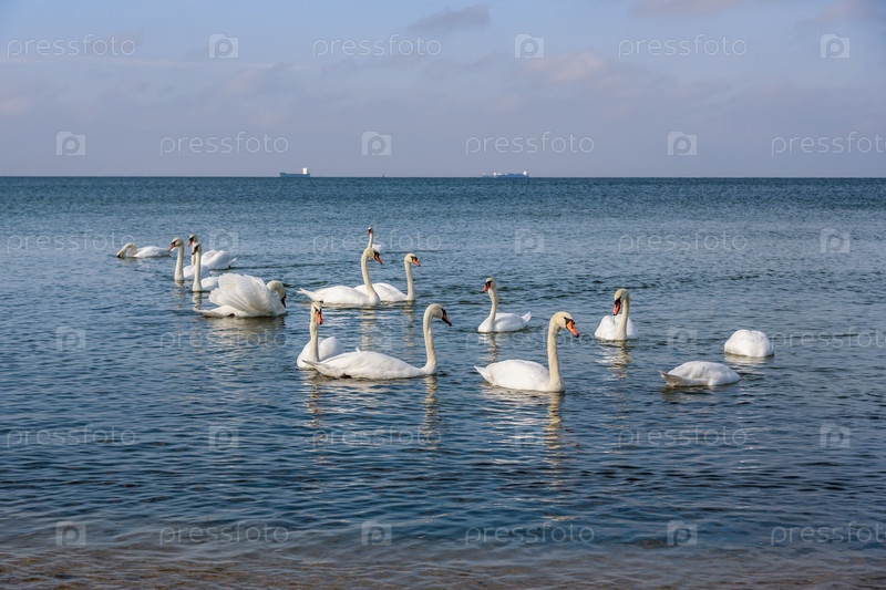 Стая белых лебедей в спокойной воде Балтийского моря у Балтийской косы. Балтийск. Калининградская область. Россия