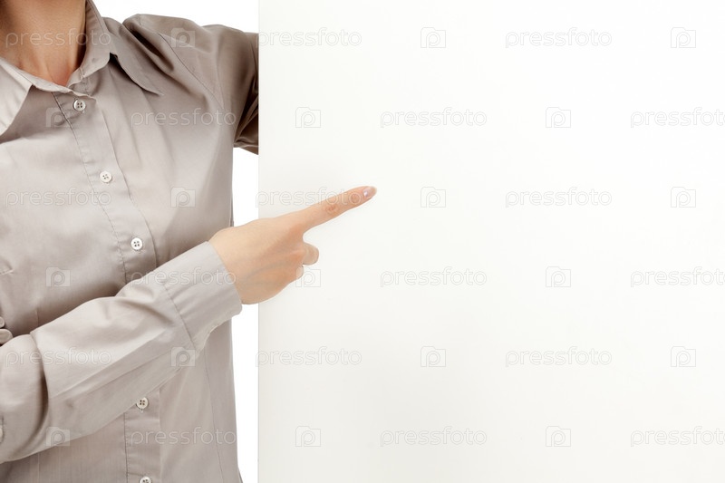 Женщина указывает пальцем на пустой белый баннер с местом для вашей информации