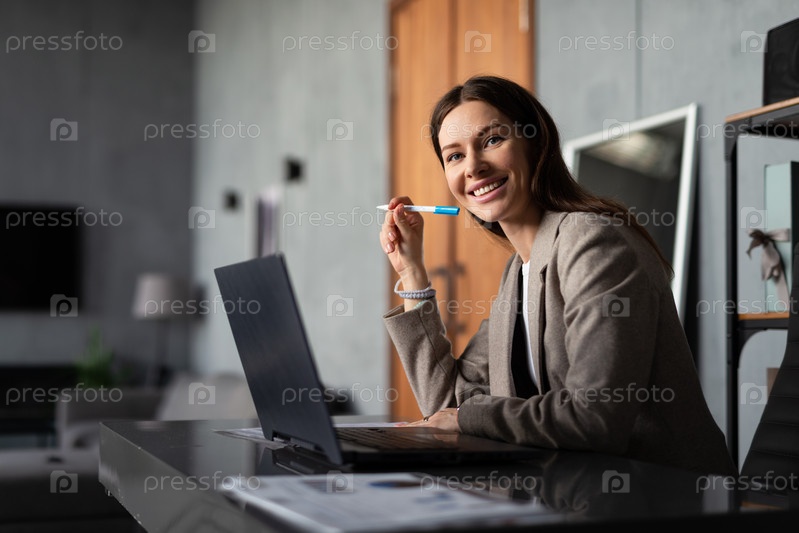 Профессиональная женщина, работающая в офисе. Она сидит за столом с ноутбуком и документами