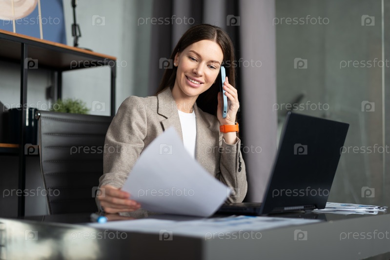 Деловая женщина разговаривает по телефону за столом и держит в руках документ