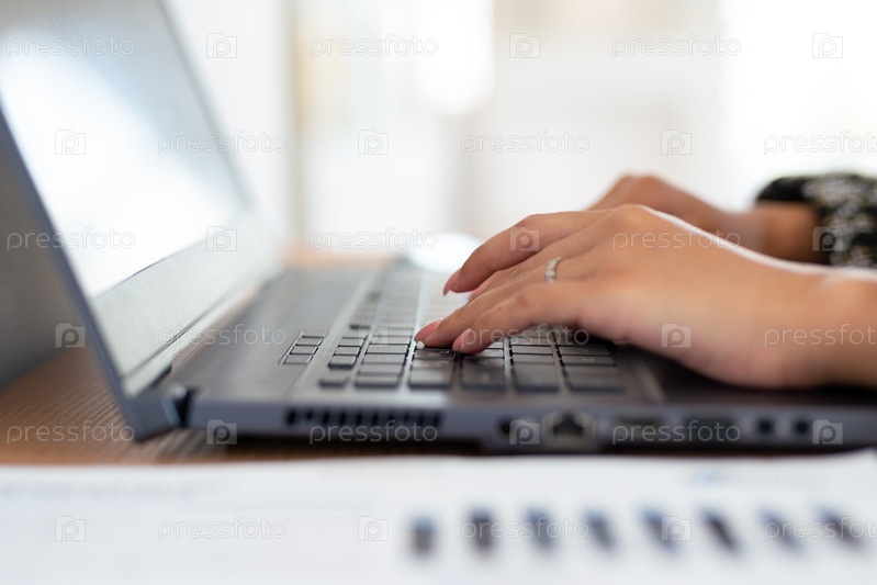Женщина работает руками на ноутбуке, ее пальцы печатают на клавиатуре, она сосредоточена на работе или просматривает онлайн-контент