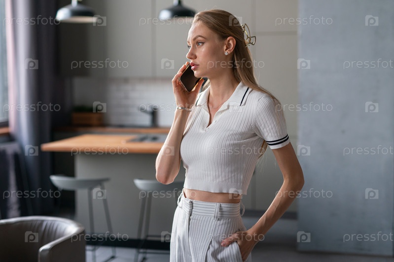 Женщина дома разговаривает по телефону