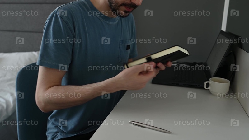 Мужчина держит в руке блокнот, открывает его и начинает писать