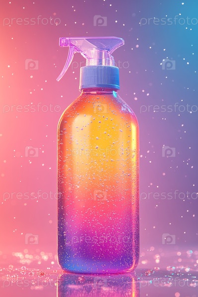Яркая прозрачная бутылка с блестящей жидкостью на мягком фоне
