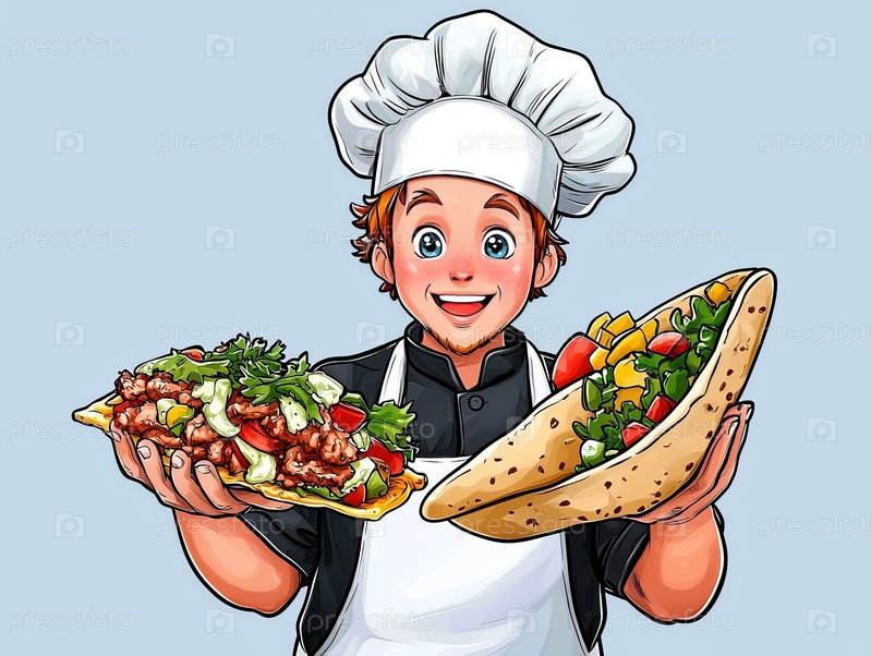 Молодой греческий шеф-повар с улыбкой держит гирос, наполненный свежими ингредиентами