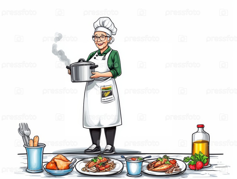 Доброжелательная пожилая женщина готовит в яркой кухне с аппетитными блюдами