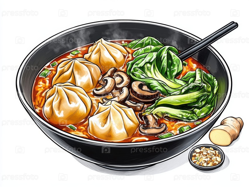 Вонтоны с грибами и зеленым луком в горячем бульоне