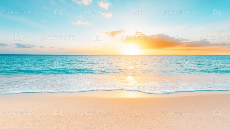 Спокойный восход солнца над тихим океаном с мягкими волнами на пляже