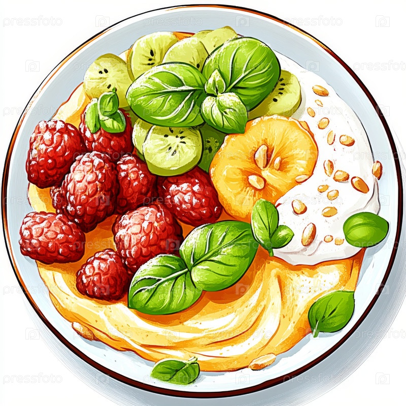 Здоровый завтрак с яркими фруктами и полезными злаками в тарелке