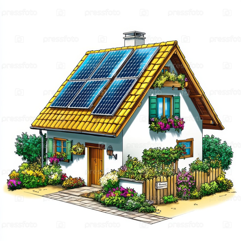 Минималистский дом с солнечными панелями и цветами в уютном саду