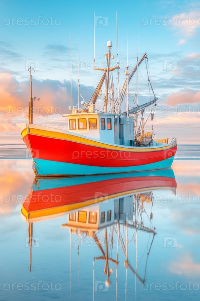 Мягкий утренний свет освещает рыболовное судно на побережье во время восхода солнца