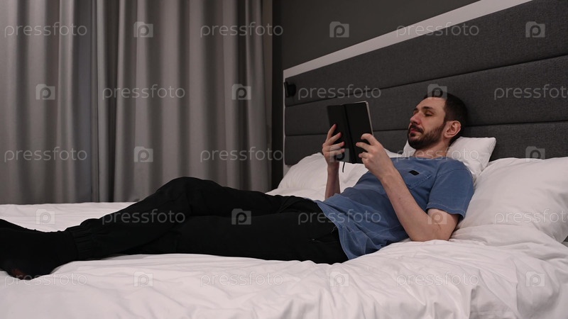 Мужчина читает книгу, лежа на кровати