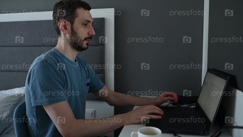 Дома мужчина пьет кофе, работая за ноутбуком
